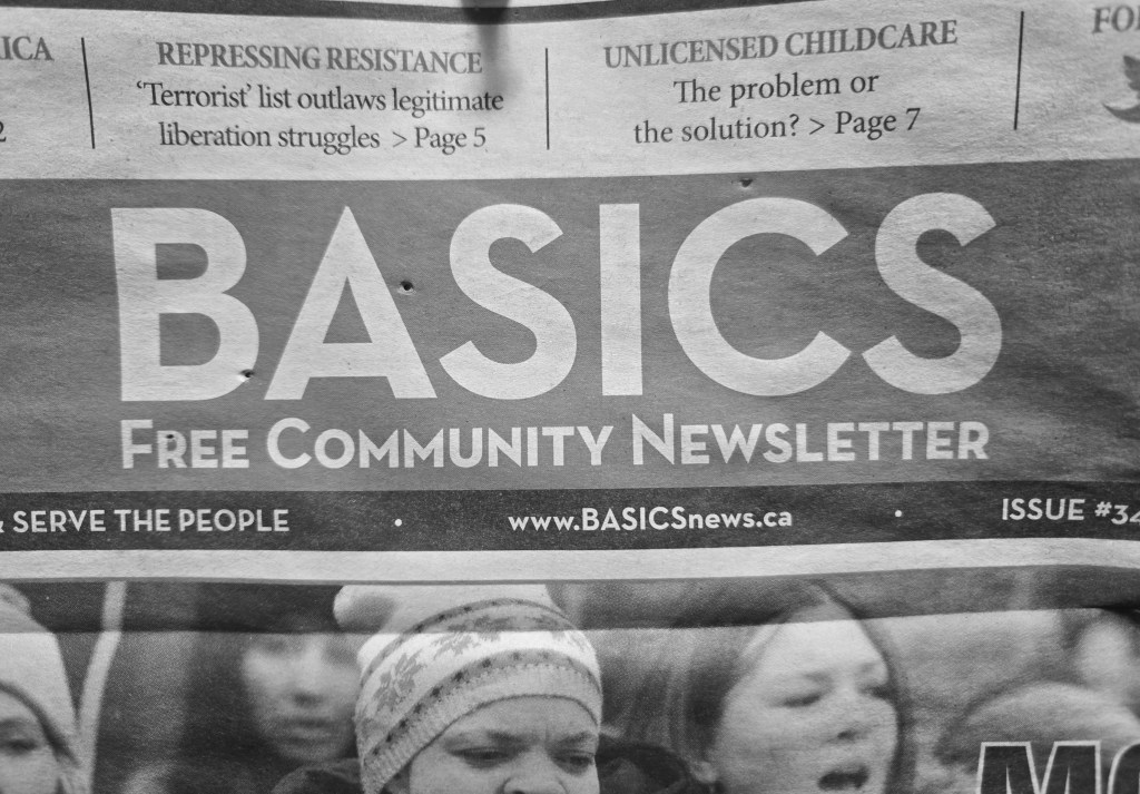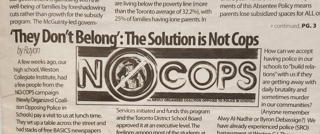Along with its peoples news media BASICS organized collective consciousness on the ground initially in Lawrence Heights, Toronto to oppose gentrification/gentrifrakation and police violence. ‘BASICS’ also offered free legal support along with many other community self-defense initiatives. The second is ‘NOCOPS’ (The Newly Organized Coalition Opposed to Police in Schools).