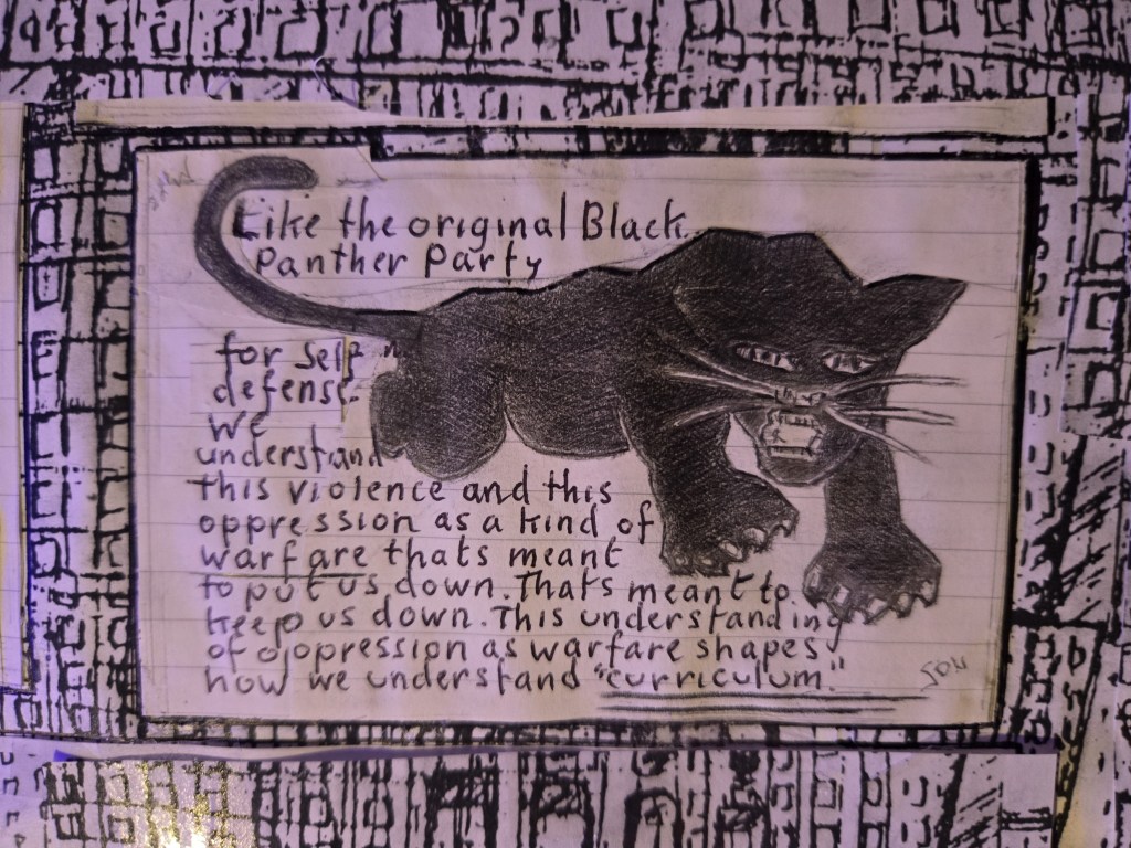 Self-defense remained as the Panther’s central organizing strategy against oppression. Self-defense for the Panthers meant self-defense against State terror, violence and oppression. It meant self-defense against colonialism and imperialism. Self-defense against violence to the land and to water, self-defense against police brutality, self-defense against incarceration, and the prison industrial complex, self-defense against poverty, self-defense against exploitation, self-defense against the denial of healthcare, self-defense against the denial of shelter, self-defense against dispossession, self-defense against the imposition of White, colonial constructions of race, gender, disability, sexuality and class, and by extension, self-defense against those education systems that do violence, that racialize, oppress, alienate, dis-intact, disintegrate, hurt and abuse the children, youth and families of the oppressed.